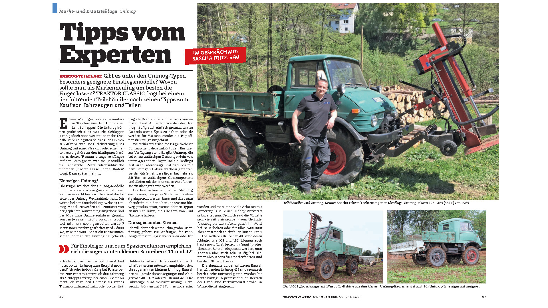 Das allseits bekannte Magazin Traktor Classic hat im Mai 2021 zum 75jährigen Unimog Jubiläum ein Sonderheft über Unimog und MB-trac herausgebracht. Im Heft ist ein ausführliches Interview mit Sascha Fritz zur Ersatzteilversorgung in der Unimog Welt abgedruckt.