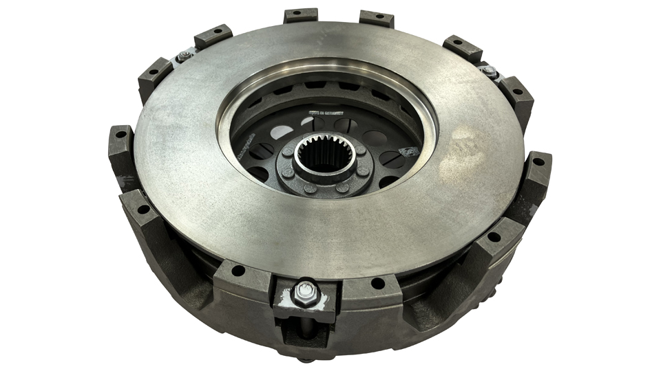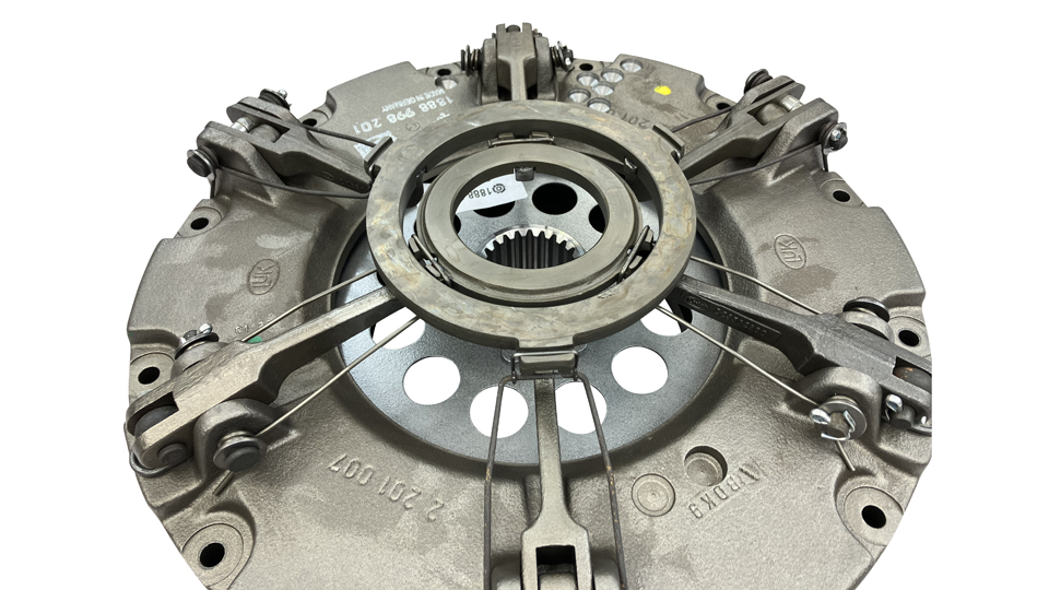 Kupplungsdruckplatte für Doppelkupplungen an den großen Unimog Baureihen. Wie üblich ist in der Druckplatte die Kupplungsscheibe für die Zapfwellenkupplung bereits eingebaut.