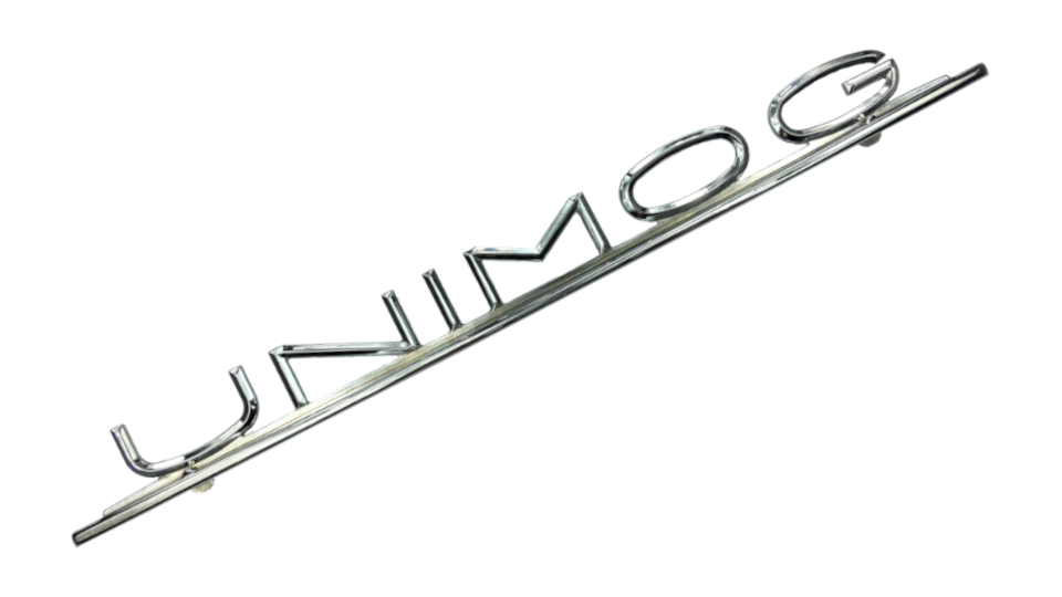 Unimog Schriftzug, der auf der Motorhaube vieler Unimogs montiert wird.