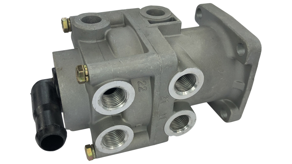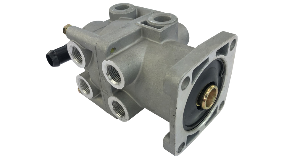Bremsventil der Fußbremse an den großen Unimog Baureihen. Das Ventil wird vom Bremspedal mittelst Gestänge betätigt. In Abhängigkeit von der Pedalstellung wird Druckluft auf den sogenannte Vorspannzylinder (Bremskraftverstärker) gegeben, der wiederrum den hydraulischen Hauptbremszylinder betätigt und so die Bremsung auslöst.